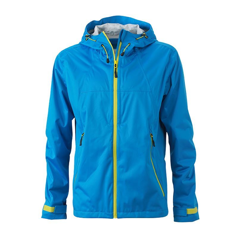 Outer fabric (130 g/m²): 100% polyester.Functional material with TPU-membrane.Wind- and waterproof (10,000 mm water column).Breathable and permeable to vapour (5,000 g/m²/24h).Taped seams, waterproof zips.2-way zip.2 zipped side pockets.Multiply adjustable hood.Ergonomically extended back.