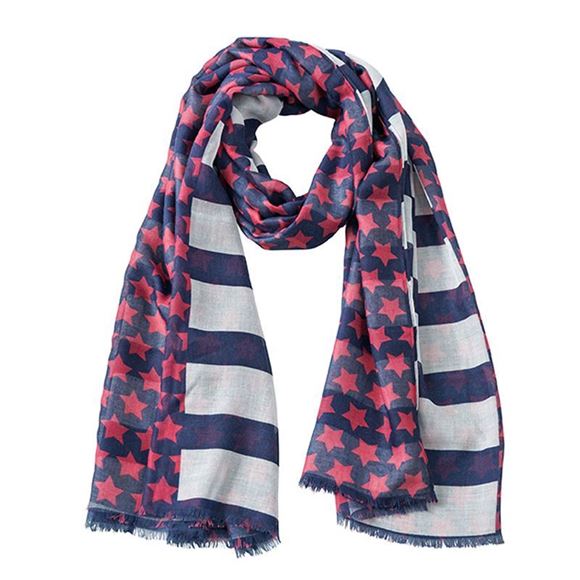 Outer fabric: 100% polyester.Stars and Stripes design.Soft and pleasant to wear.Rolled edges on long sides.Fine fringes.Measurements: 180 x 110 cm.